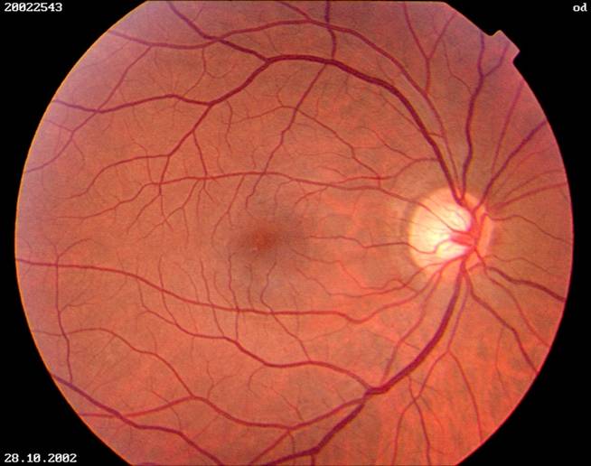 Abb. 3: Fotografie einer gesunden Netzhaut mit der „Makula lutea“, der Stelle des schärfsten Sehens in der Bildmitte