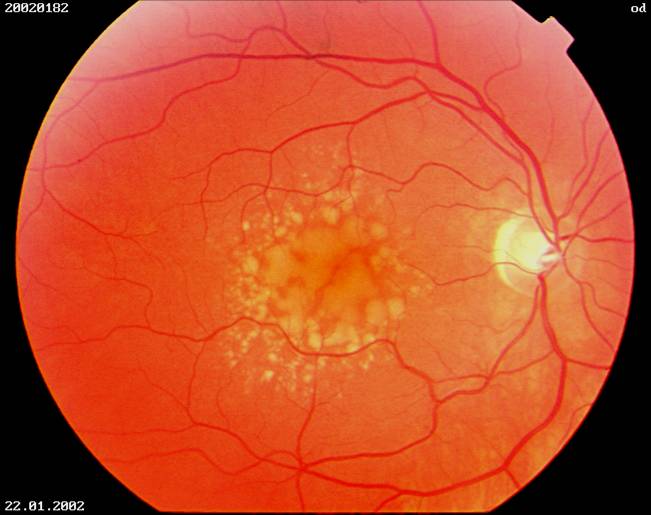 Abb. 4: Als Drusen bezeichnete Ablagerungen im Bereich der Makula kennzeichnen das frühe Stadium der AMD.