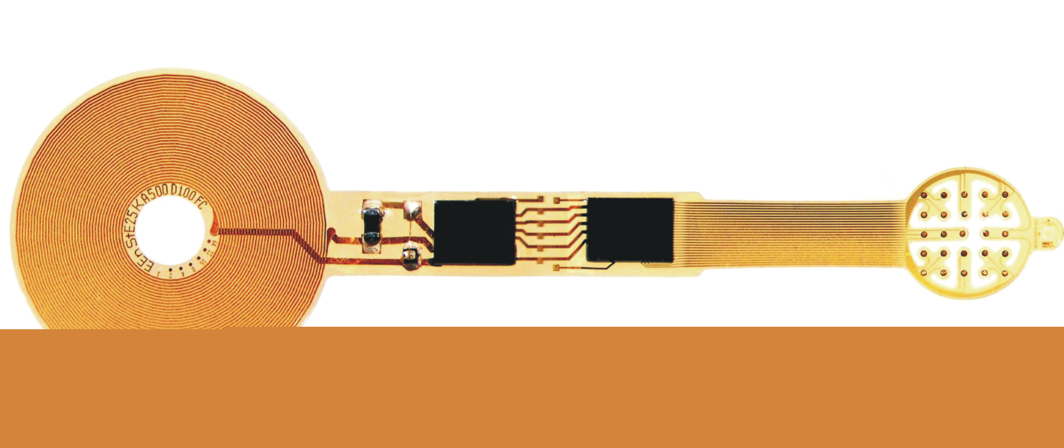 Abbildung 1: Die Mikroelektrodenfolie am rechten Ende wird auf der Netzhaut (Retina) fixiert. Das andere Ende enthält eine Antennenspule für kabelfreie Daten- und Energieübertragung, dazwischen eine ultraflexible Verbindung. Die Netzhaut wird stimuliert, Sehwahrnehmungen werden möglich.