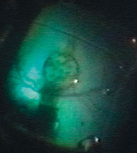 Abbildung 2: Die Verträglichkeit des epiretinalen Implantats hat sich in jahrelanger Forschungsarbeit als sehr gut erwiesen. Hier sieht man den Stimulatorkopf auf der Netzhaut im Tiermodell.